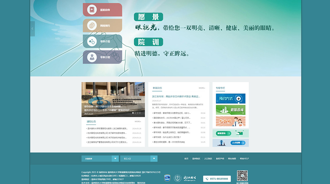 溫州醫(yī)科大學(xué)附屬眼視光醫(yī)院成立于1998年,2009年經(jīng)省衛(wèi)生廳批準(zhǔn)增掛“浙江省眼科醫(yī)院”,2010年開設(shè)杭州院區(qū),是浙江省首家三級(jí)甲等眼科??漆t(yī)院。醫(yī)院承擔(dān)臨床醫(yī)療、醫(yī)學(xué)教育、醫(yī)學(xué)科研、預(yù)防保健等任務(wù),是國家眼部疾病臨床醫(yī)學(xué)研究中心、眼視光學(xué)和視覺科學(xué)國家重點(diǎn)實(shí)驗(yàn)室、國家眼視光工程技術(shù)研究中心、國家藥監(jiān)局眼科疾病醫(yī)療器械和藥物臨床研究與評(píng)價(jià)重點(diǎn)實(shí)驗(yàn)室,以及國家眼科學(xué)臨床重點(diǎn)???、教育部近視防控與診治工程研究中心。