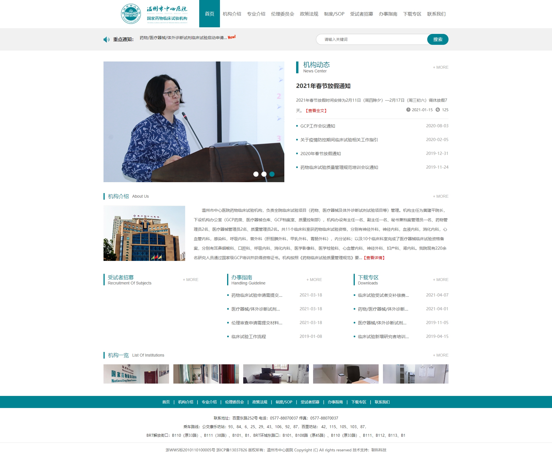 溫州市中心醫(yī)院藥物臨床試驗(yàn)機(jī)構(gòu),負(fù)責(zé)全院臨床試驗(yàn)項(xiàng)目(藥物、醫(yī)療器械及體外診斷試劑等)管理。機(jī)構(gòu)主任為黃建平書記,機(jī)構(gòu)副主任張立群院長(zhǎng),下設(shè)機(jī)構(gòu)辦公室(GCP藥房、醫(yī)療器械倉(cāng)庫(kù)、GCP檔案室、質(zhì)量控制部),機(jī)構(gòu)辦設(shè)有主任1名、副主任1名、秘書兼資料管理員1名、藥物管理員2名、醫(yī)療器械管理員2名、質(zhì)量管理員2名。共11個(gè)臨床科室獲藥物臨床試驗(yàn)資格,分別有神經(jīng)外科,神經(jīng)內(nèi)科,血液內(nèi)科,消化內(nèi)科,心血管內(nèi)科,感染科, 呼吸內(nèi)科,普外科(肝膽胰外科,甲乳外科,胃腸外科),內(nèi)分泌科。