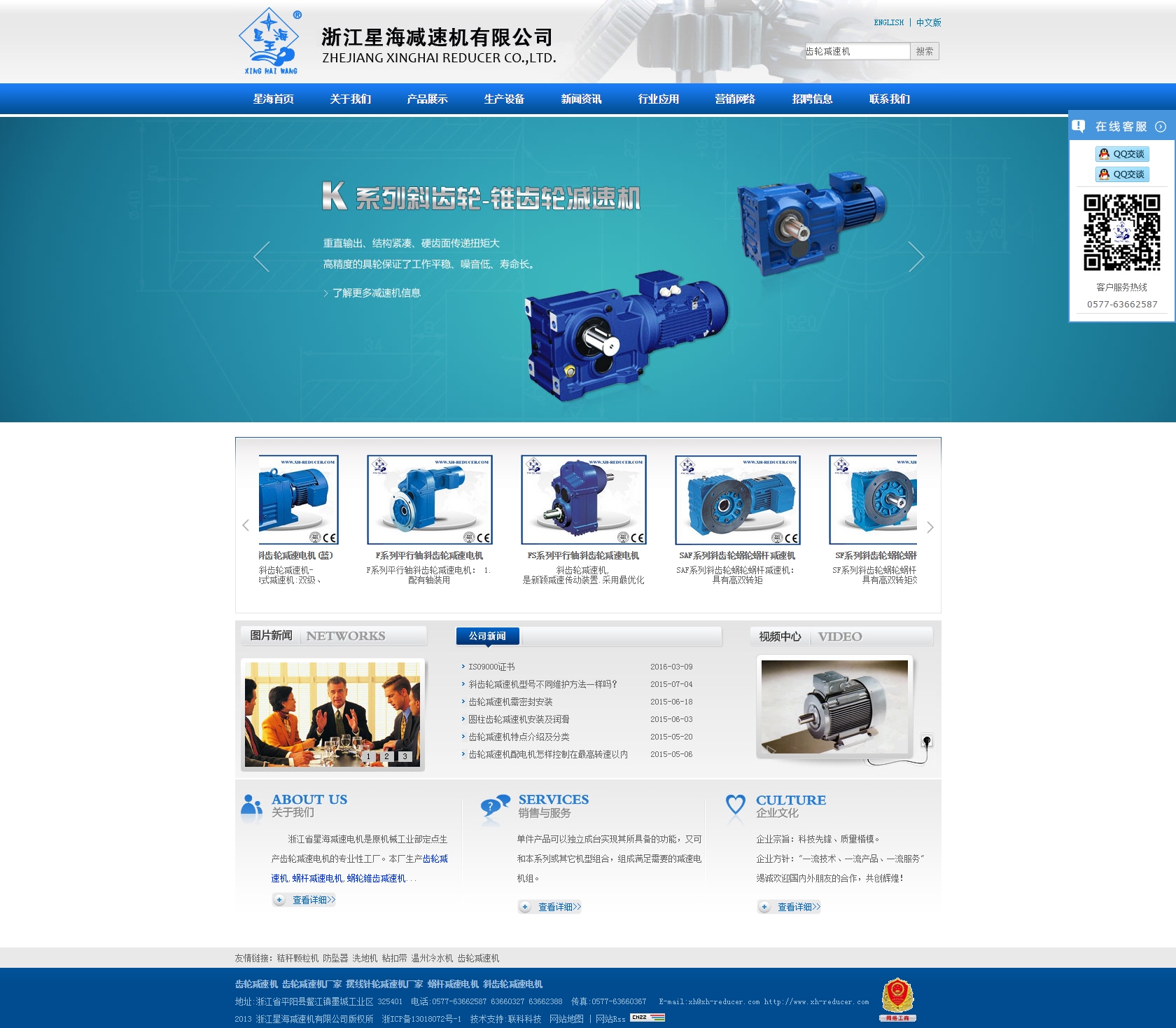 浙江星海減速機(jī)有限公司是原機(jī)械工業(yè)部定點生產(chǎn)齒輪減速電機(jī)的專業(yè)性工廠,公司通過了ISO9001:2008質(zhì)量體系認(rèn)證,國家高新技術(shù)企業(yè),浙江省科技型企業(yè),溫州市高成長型企業(yè),平陽縣專利示范企業(yè)和溫州市知名商標(biāo)。本廠生產(chǎn)R系列斜齒輪減速電機(jī)(齒輪減速機(jī)),S系列斜齒輪—蝸輪減速電機(jī)(蝸輪減速機(jī)),F(xiàn)系列平行軸斜齒輪減速電機(jī),K系列斜齒輪—錐齒輪減速電機(jī),擺線針輪減速機(jī),T系列螺旋錐齒輪轉(zhuǎn)向箱,H、B系列標(biāo)準(zhǔn)工業(yè)齒輪箱,蝸輪絲桿升降機(jī),RV系列蝸輪蝸桿減速機(jī),ZDY、ZLY、ZSY硬齒輪圓柱齒輪減速機(jī),DBY、DCY硬齒面圓錐圓柱齒輪減速機(jī),ZD、ZL、ZS、ZQ圓柱齒輪減速機(jī)等數(shù)千種規(guī)格的產(chǎn)品,是目前國際上工業(yè)動力傳輸領(lǐng)域最普遍采用的減速驅(qū)動裝置。