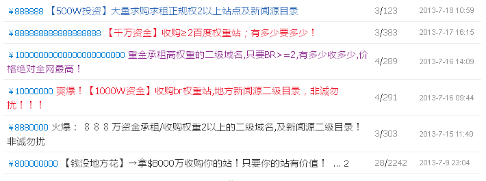 2013年7月19日百度網(wǎng)頁搜索反作弊團隊對于一些論壇出現(xiàn)大量的高價收購二級域名或目錄的信息,絕大部分被用于作弊,例如:太原新聞網(wǎng),出售二級目錄被用于作弊。對于此類出售二級域名二級目錄的問題,將進行嚴厲的懲罰,株連至整個站點,直接屏蔽并清理出百度新聞源。