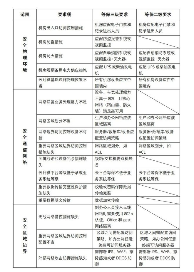 本文參考了《T/ISEAA 001-2020 網(wǎng)絡(luò)安全等級保護(hù)測評高風(fēng)險判定指引》,整理出了等保三級、二級所需產(chǎn)品和要求。研發(fā)或運(yùn)維人員通過該表可直觀了解自己的系統(tǒng)與等保要求存在的差距,并做出相應(yīng)整改。