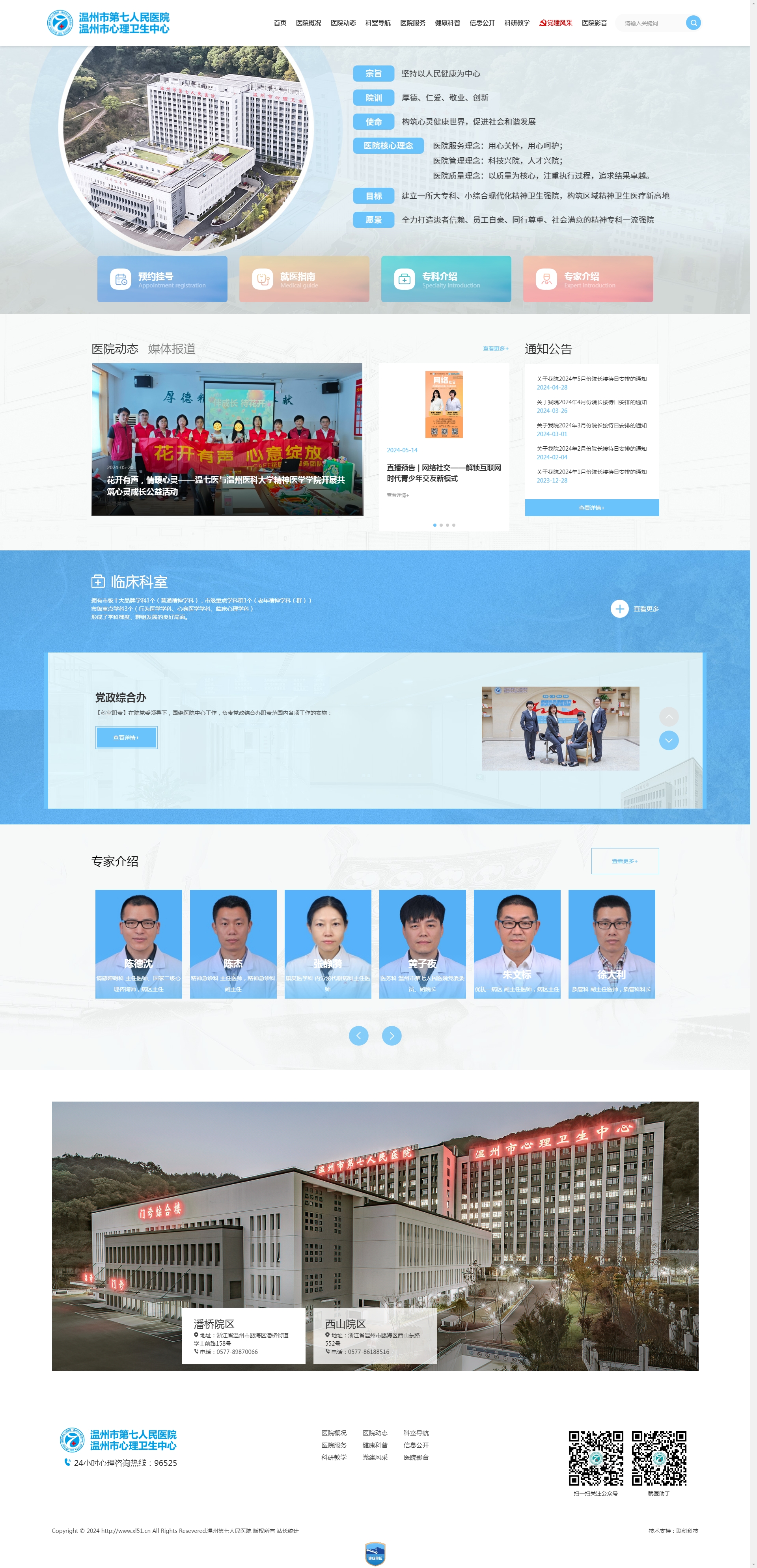溫州市第七人民醫(yī)院創(chuàng)建于1959年8月,是溫州市本級(jí)直屬的唯一一家公立三級(jí)精神??漆t(yī)院,承擔(dān)全市的精神衛(wèi)生醫(yī)療、教學(xué)、科研、預(yù)防、康復(fù)、心理咨詢和對(duì)外學(xué)術(shù)交流等任務(wù)。醫(yī)院現(xiàn)為溫州市精神衛(wèi)生辦公室掛靠單位,上海交通大學(xué)Bio-X研究院附屬醫(yī)院;上海市精神衛(wèi)生中心、香港理工大學(xué)協(xié)作醫(yī)院;山東濟(jì)寧醫(yī)學(xué)院、溫州醫(yī)科大學(xué)、溫州大學(xué)實(shí)習(xí)醫(yī)院;浙江省平安醫(yī)院、浙江省健康促進(jìn)醫(yī)院、浙江省綠色醫(yī)院、浙江省智慧安防醫(yī)院,浙江省老年友善型醫(yī)院,溫州市文明單位、溫州市節(jié)約型公共機(jī)構(gòu)示范單位等。