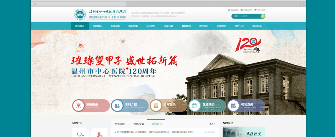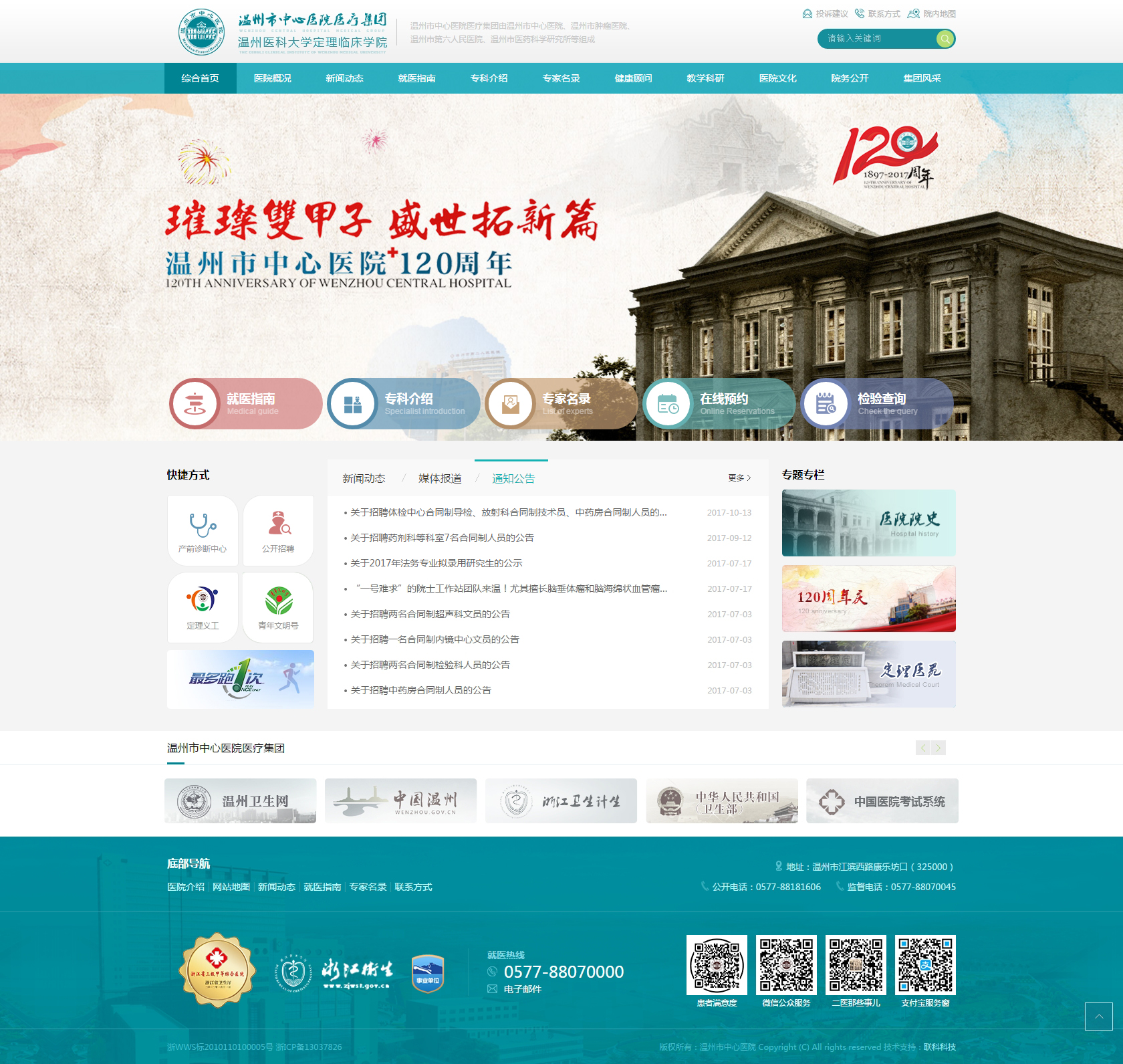 溫州市中心醫(yī)院(溫州市腫瘤醫(yī)院、溫州市醫(yī)藥科學(xué)研究所)坐落在美麗的甌江之濱,是一所集醫(yī)療、教學(xué)、科研、預(yù)防、保健、康復(fù)為一體的三級(jí)甲等綜合醫(yī)院,是浙江三家百年名院之一。醫(yī)院始建于1897年(清光緒23年),前身是定理醫(yī)院、白累德醫(yī)院、溫州市第二人民醫(yī)院。2002年—2003年,醫(yī)院先后和溫州市醫(yī)藥科學(xué)研究所、溫州市第五人民醫(yī)院、溫州市腫瘤醫(yī)院資產(chǎn)重組合并,成為三院一所格局的醫(yī)療集團(tuán);2008年成為溫州醫(yī)科大學(xué)附屬醫(yī)院——定理臨床學(xué)院;2012年晉級(jí)三級(jí)甲等綜合醫(yī)院,更名為溫州市中心醫(yī)院;2015年成立溫州