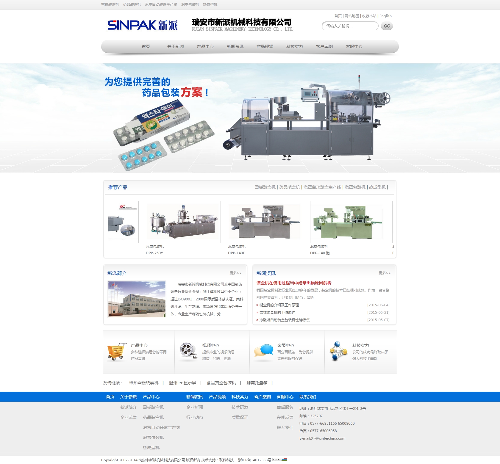瑞安市新派機(jī)械科技有限公司系中國(guó)制藥裝備行業(yè)協(xié)會(huì)會(huì)員;浙江省科技型中小企業(yè);通過ISO9001:2000國(guó)際質(zhì)量體系認(rèn)證。集科研開發(fā)、生產(chǎn)制造。市場(chǎng)營(yíng)銷和售后服務(wù)與一體,專業(yè)生產(chǎn)食品、日化行業(yè)的泡罩包裝機(jī)和裝盒機(jī)械。憑借雄厚的技術(shù)力量;精良的制造加工設(shè)備;完善的檢測(cè)手段及健全的管理體系,精心為客戶技術(shù)先進(jìn)優(yōu)良并符合GMP要求的產(chǎn)品。