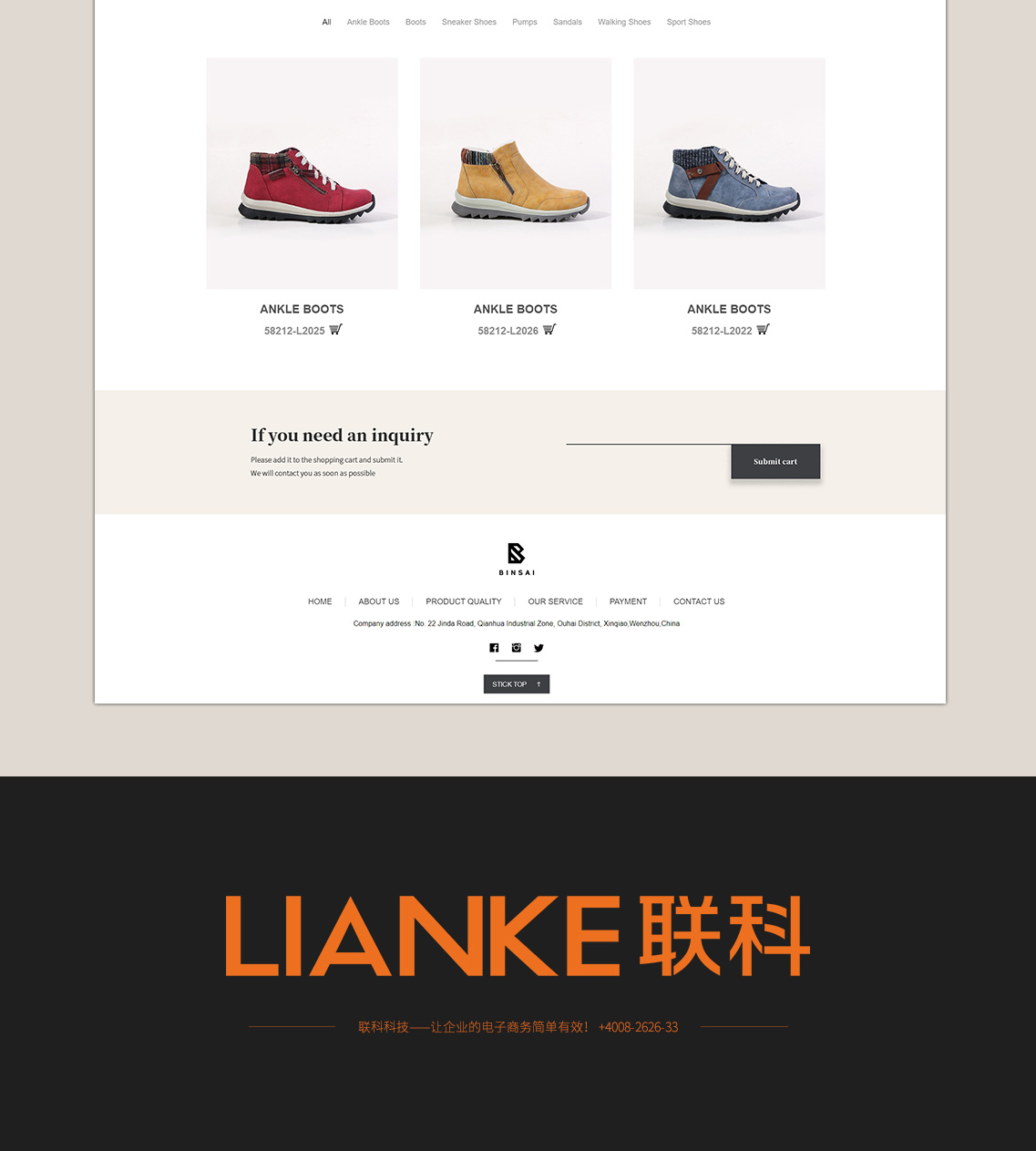 he company's predecessor was ZHONGHE leather shoes factory. In 2000, Wenzhou BINSAI Shoes Co., Ltd. was established. In 2009, the company began t