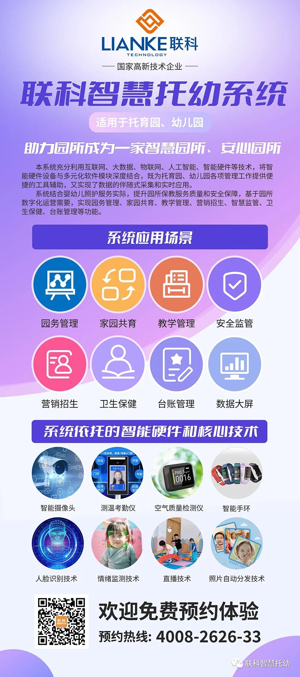 《聯(lián)科智慧托幼系統(tǒng)》充分利用互聯(lián)網(wǎng)、大數(shù)據(jù)、物聯(lián)網(wǎng)、人工智能、智能硬件等技術(shù),將智能硬件設(shè)備與多元化軟件模塊深度結(jié)合,既為托育園、幼兒園各項(xiàng)管理工作提供便捷的工具輔助,又實(shí)現(xiàn)了數(shù)據(jù)的伴隨式采集和實(shí)時(shí)應(yīng)用。系統(tǒng)結(jié)合嬰幼兒照護(hù)服務(wù)實(shí)際,提升園所保教服務(wù)質(zhì)量和安全保障,基于園所數(shù)字化運(yùn)營(yíng)需要,實(shí)現(xiàn)園務(wù)管理、家園共育、教學(xué)管理、營(yíng)銷招生、智慧監(jiān)管、衛(wèi)生保健、臺(tái)賬管理等功能。