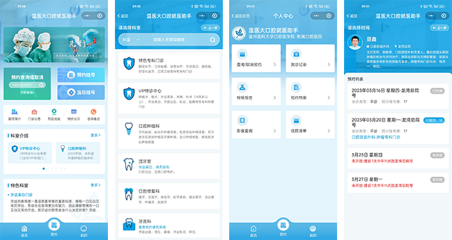 為溫醫(yī)大附屬口腔醫(yī)院開發(fā)的微信小程序應(yīng)用,根據(jù)需求進(jìn)行整體UI設(shè)計(jì),呈現(xiàn)更好地視覺效果,優(yōu)化患者預(yù)約、查詢等功能的用戶體驗(yàn)。包括預(yù)約掛號(hào)、當(dāng)日掛號(hào)、科室介紹、物價(jià)公示、專家介紹、查詢就診記錄、體檢報(bào)告、醫(yī)療影像、住院清單等功能,助力醫(yī)院更好服務(wù)患者。